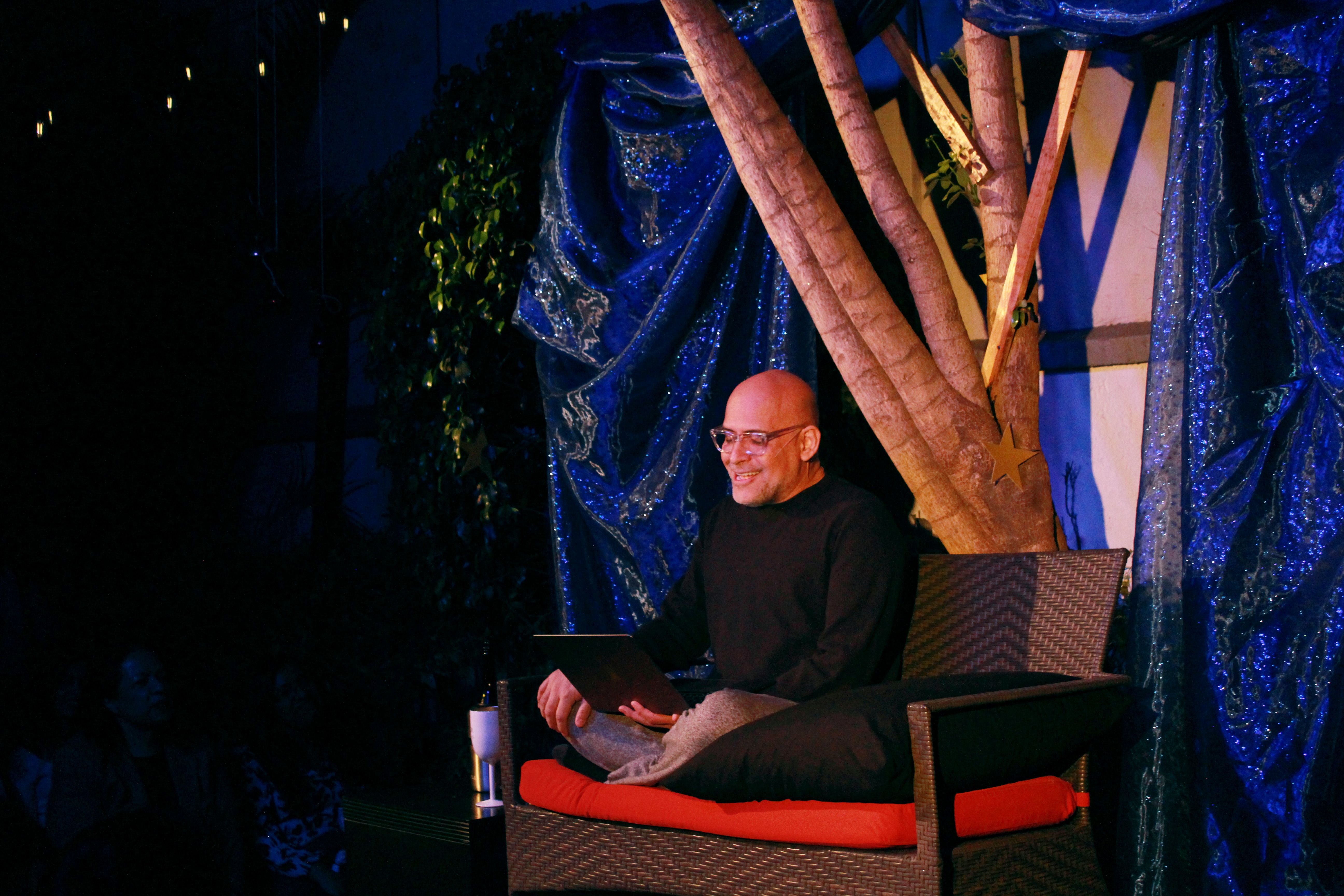 En este íntimo espectáculo lee fragmentos de sus próximos proyectos literarios, habla un poco de teatro y lee algo de poesía, mientras disfruta una copa de vino y la exclusiva compañía.